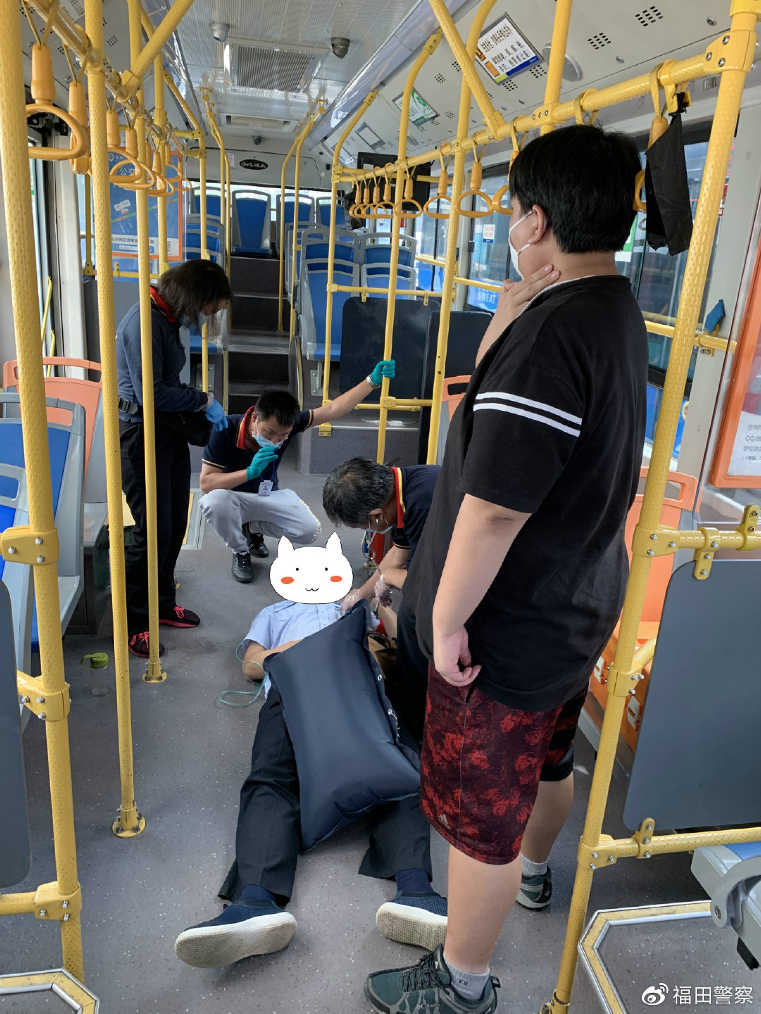 6月12日11時許,接到派出所報稱某站臺處公交車司機因胸口悶需要救助的指令后,巡邏民警迅速趕到現(xiàn)場。到達現(xiàn)場時,民警見司機躺在公交車的地上,于是立刻協(xié)助120醫(yī)務人員實施緊急救助,并將司機抬上救護車,由120醫(yī)務人員送往醫(yī)院。兩名輔警則留下看管公交車,確保其安全,直至巴士公司交接人把車開走。