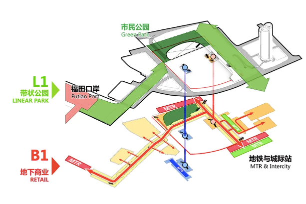 地下一層——軌道換乘:通過“城市通廊”實現(xiàn)周邊多條軌道站點的高效換乘,并實現(xiàn)新舊口岸、軌道交通及城市綠軸的高度復(fù)合。
