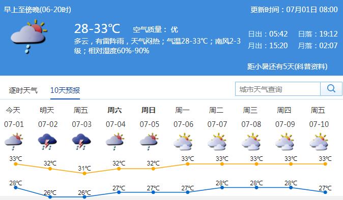 見(jiàn)圳客戶端·深圳新聞網(wǎng)2020年7月1日訊 我市今日晴天間多云,局地有短時(shí)(雷)陣雨;氣溫28-33℃,中北部及人口密集區(qū)最高氣溫可達(dá)35℃以上;偏南風(fēng)2-3級(jí);相對(duì)濕度60%-90%。