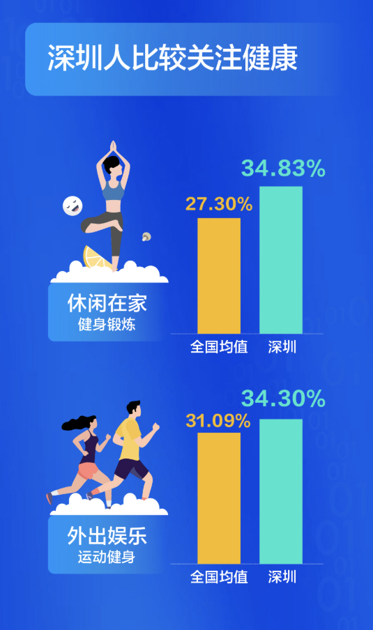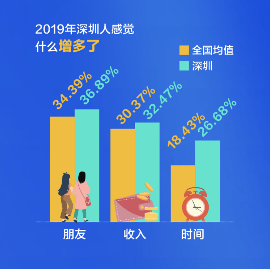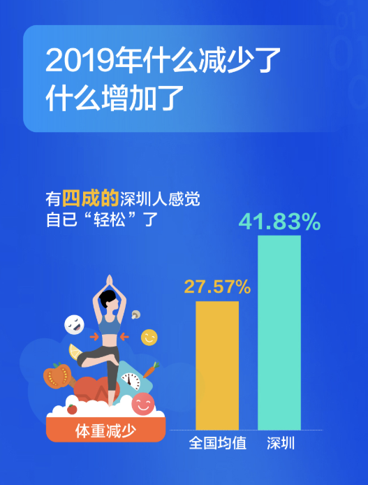 深圳人比較關(guān)注健康,不管是宅在家還是外出娛樂(lè),他們選擇運(yùn)動(dòng)健身的比例都超過(guò)全國(guó)平均水平,對(duì)健康的投資,成就了又一個(gè)“苗條之城”。過(guò)去這一年,有四成的深圳人感覺(jué)自已“輕松”了,體重減少的人群比例高出全國(guó)近14個(gè)百分點(diǎn)。甩掉了贅肉的同時(shí),深圳人還感覺(jué)在時(shí)間、朋友、收入這三方面的收獲在增加。尤其是時(shí)間,超出了全國(guó)均值8個(gè)百分點(diǎn)。