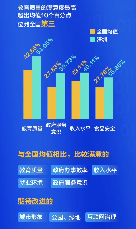 在針對(duì)城市治理能力和社會(huì)服務(wù)的20多項(xiàng)滿意度指標(biāo)中,深圳有19項(xiàng)高于全國(guó)省會(huì)城市和直轄市平均水平。其中,市民對(duì)教育服務(wù)的滿意度最高,超出均值10個(gè)百分點(diǎn),位列全國(guó)第三,其次是治安狀況和水、空氣質(zhì)量,而在政府服務(wù)意識(shí)和食品安全的滿意度,也排在全國(guó)同類(lèi)第一名。此外,日常生活中的收入和就業(yè),也讓深圳人感覺(jué)比較踏實(shí)。