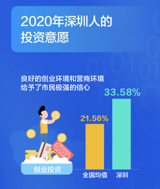 有了錢(qián),深圳人會(huì)投資什么?大調(diào)查發(fā)現(xiàn),深圳人在創(chuàng)業(yè)投資的選擇占比高達(dá)33.58%,比全國(guó)平均水平要高出12個(gè)百分點(diǎn),良好的創(chuàng)業(yè)環(huán)境和營(yíng)商環(huán)境給予了市民極強(qiáng)的信心。從不同年齡段來(lái)看,創(chuàng)業(yè)投資意愿最高的是36-45歲的群體,不同行業(yè)中,服務(wù)業(yè)和金融業(yè)創(chuàng)業(yè)投資的意愿更高一些。