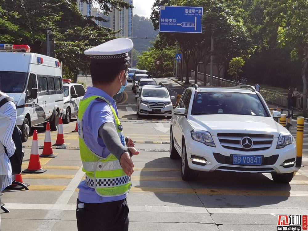 【紅嶺中學】考點門口正在指揮車輛通行的交警。