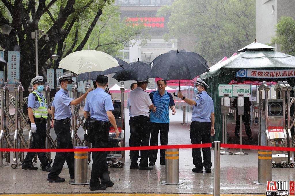 上午11時(shí),深圳部分地區(qū)下起陣雨,交警在考點(diǎn)外了解現(xiàn)場(chǎng)情況。