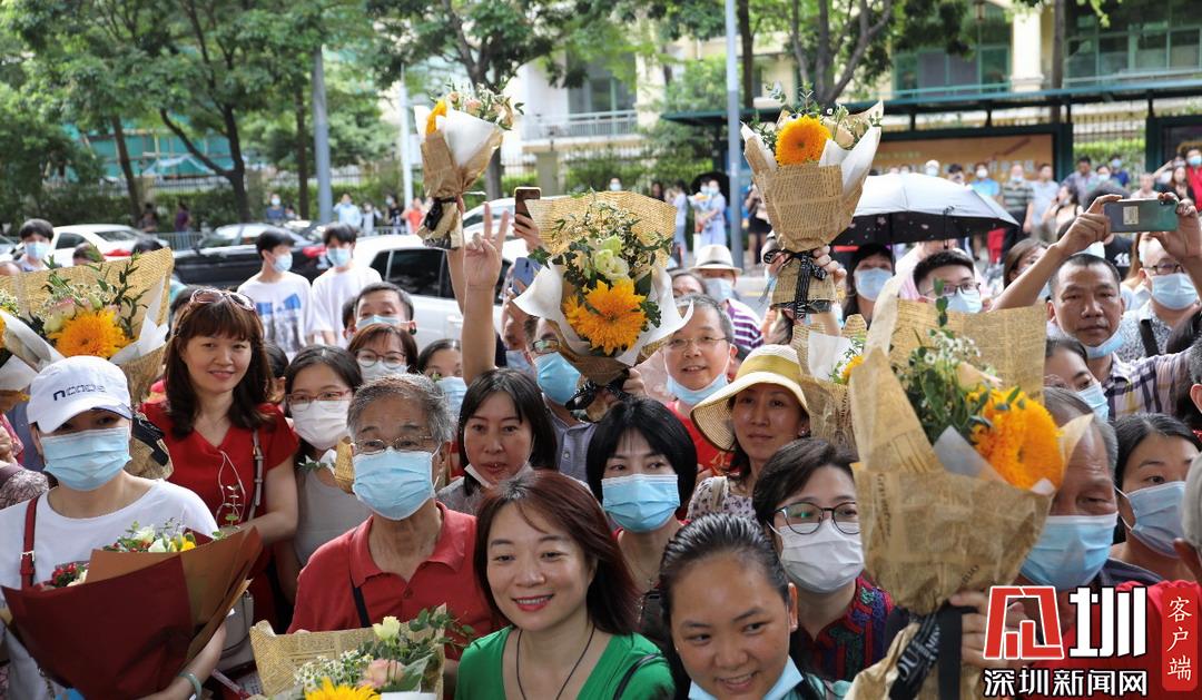考生家長手拿向日葵,??忌慌e奪魁。