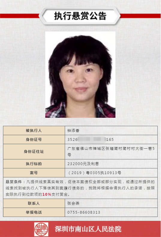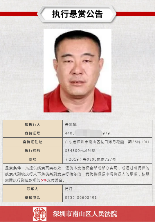 經申請執(zhí)行人申請,深圳市南山區(qū)人民法院向社會發(fā)布懸賞舉報公告,凡提供線索真實有效,促使本案債權全部或部分實現(xiàn),或通過所提供的線索找到被執(zhí)行人下落使其到案履行債務的,深圳市南山區(qū)人民法院將根據申請執(zhí)行人的承諾,按照實際執(zhí)行到位款項給予一定金額的賞金。