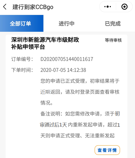 客戶完成補(bǔ)貼申請(qǐng)?zhí)峤缓?,平臺(tái)將進(jìn)行首次初審,初審結(jié)果將于近期返回并通過(guò)短信方式告知客戶。屆時(shí),客戶可通過(guò)登錄“建行到家CCBgo-我的-我的申請(qǐng)”查看審核進(jìn)展。
