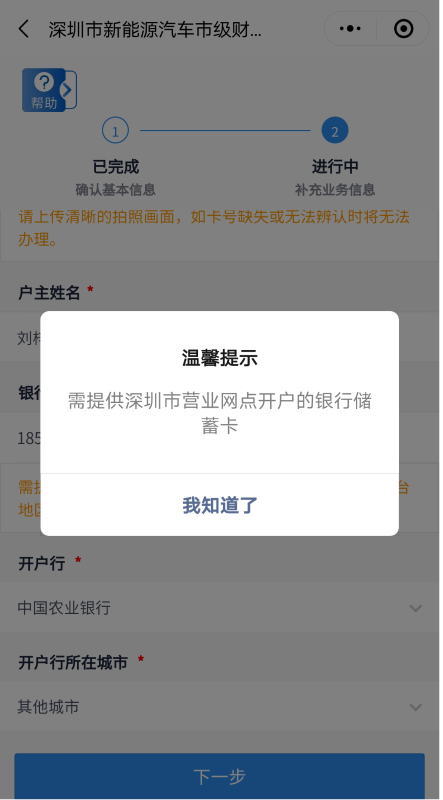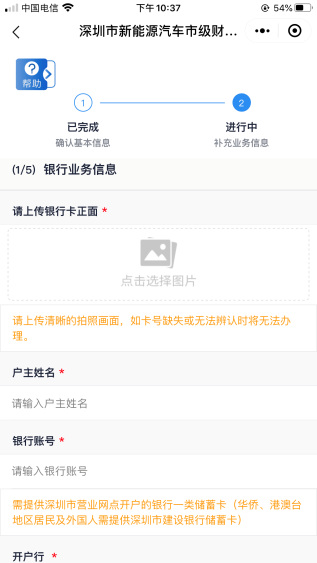 客戶需上傳銀行卡照片,并填寫(xiě)銀行賬號(hào)、開(kāi)戶行信息。開(kāi)戶行如不在選項(xiàng)范圍內(nèi)可選擇“其他”自填。其中,銀行賬號(hào)需為深圳市營(yíng)業(yè)網(wǎng)點(diǎn)開(kāi)戶的銀行一類(lèi)儲(chǔ)蓄卡,華僑、港澳臺(tái)地區(qū)居民及外國(guó)人需提供深圳市建設(shè)銀行一類(lèi)儲(chǔ)蓄卡。