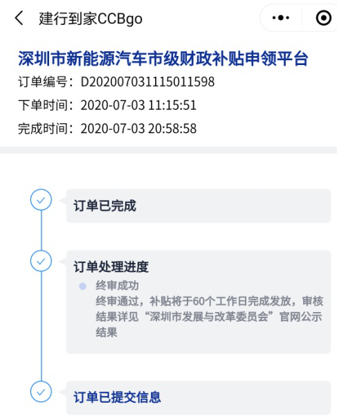客戶可通過(guò)i深圳微信公眾號(hào)、深圳市發(fā)展和改革委員會(huì)官方網(wǎng)站或微信公眾號(hào)、深圳交警微信公眾號(hào)或建行到家CCBgo小程序登錄“深圳市新能源汽車(chē)市級(jí)財(cái)政補(bǔ)貼申領(lǐng)”平臺(tái)。
