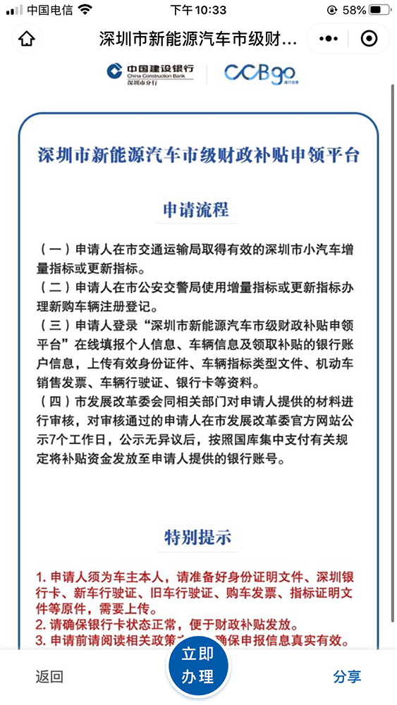 客戶進(jìn)入平臺(tái)后,可查詢平臺(tái)申請(qǐng)流程、注意事項(xiàng)。點(diǎn)擊“立即辦理”后,可進(jìn)一步在線閱讀《深圳市應(yīng)對(duì)新冠肺炎疫情影響促進(jìn)新能源汽車(chē)推廣應(yīng)用若干措施》、《深圳市應(yīng)對(duì)新冠肺炎疫情影響促進(jìn)新能源汽車(chē)推廣應(yīng)用若干措施財(cái)政補(bǔ)貼申領(lǐng)工作指引》等政府相關(guān)政策文件。