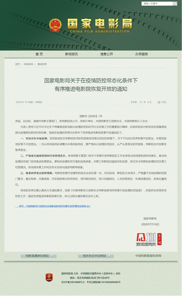 有序推進電影院恢復開放的通知