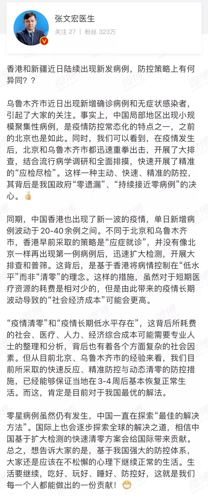 7月18日8時許,上海復旦大學附屬華山醫(yī)院感染科主任@張文宏醫(yī)生在微博上就“香港和新疆近日出現(xiàn)新發(fā)病例”發(fā)聲。