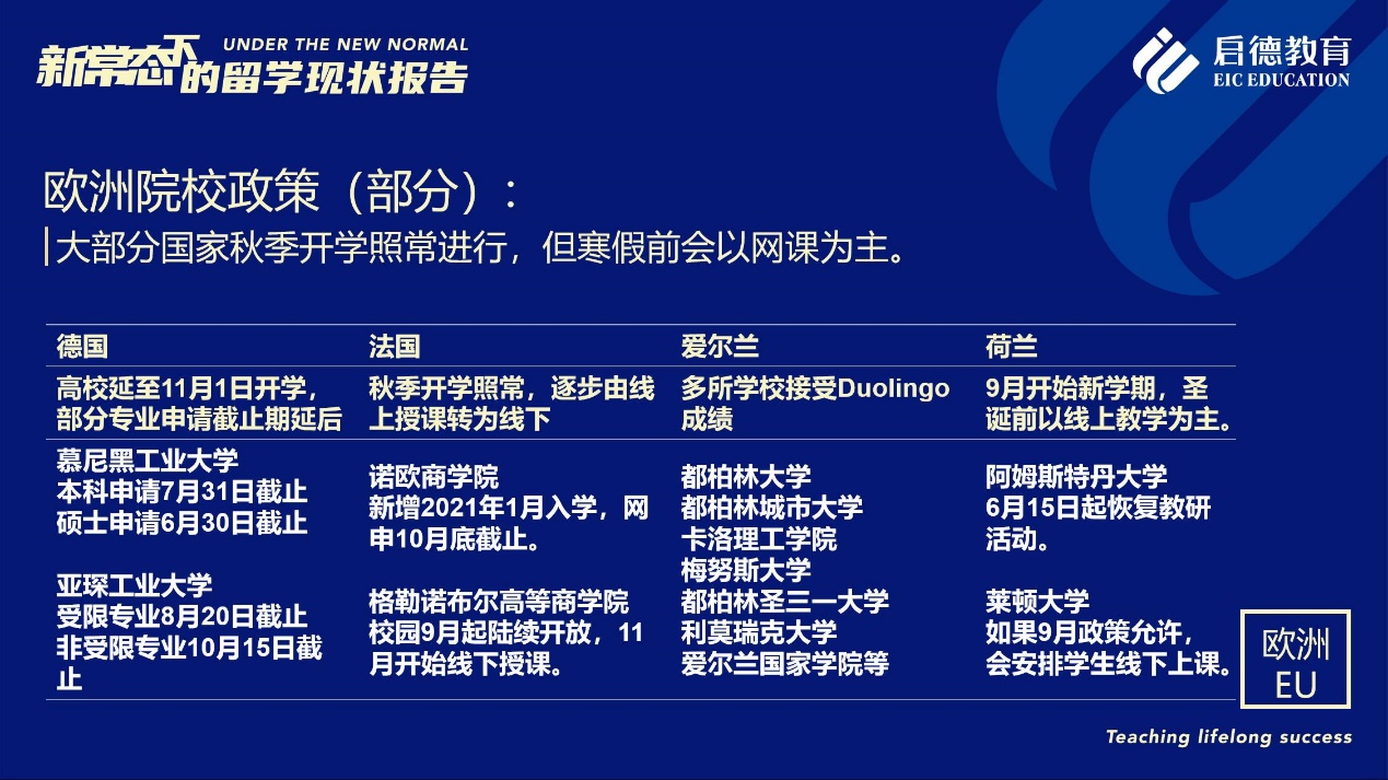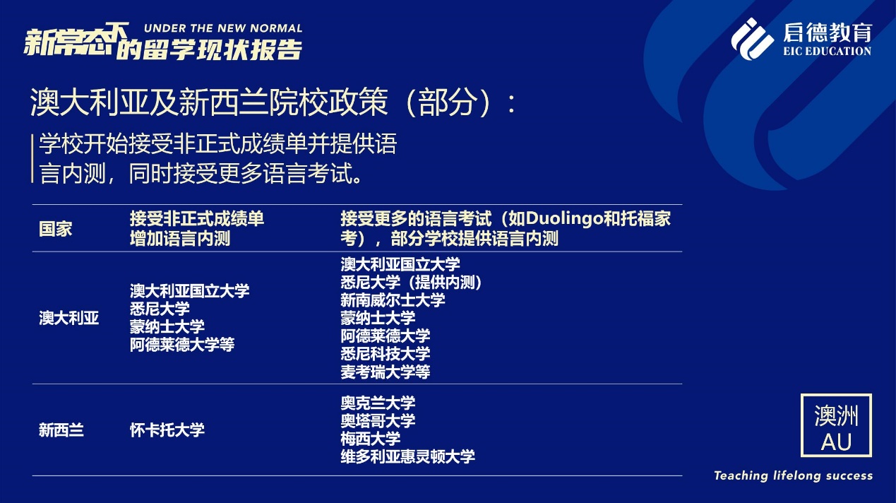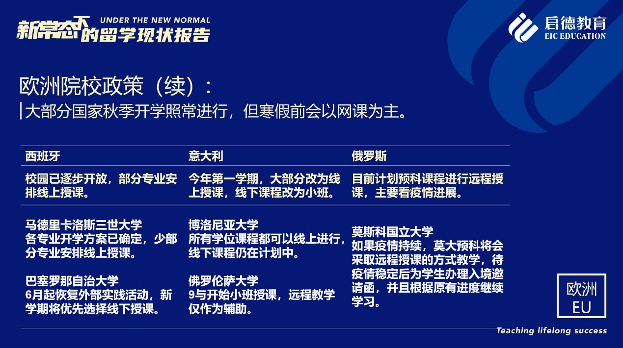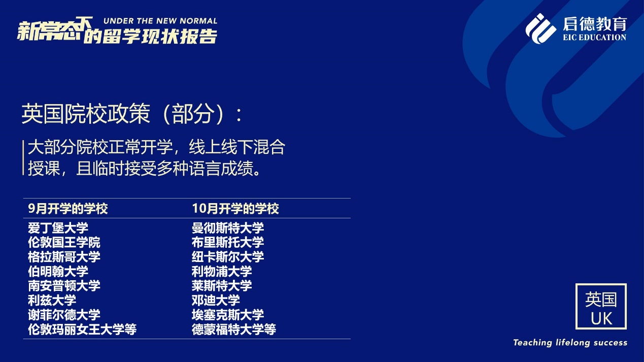 《報告》也梳理了近期各主要留學目的國及院校針對國際學生出臺的各類政策。據(jù)啟德留學英愛項目總監(jiān)孫波介紹,國內英國簽證中心已經重新開放。準備赴英讀研的學生,部分大學明確表示秋季可以正常開學,大課將會采用線上授課的方式,小班授課線下進行;還有部分大學向學生提供更加靈活的入讀方案,學生可以選擇9月入讀或者1月入讀。此外,從2021年開始,在英國完成博士學位的國際學生將會獲得3年有效期的 PSW工作簽證,本科生和碩士生可以獲得2年有效期的 PSW工作簽證。