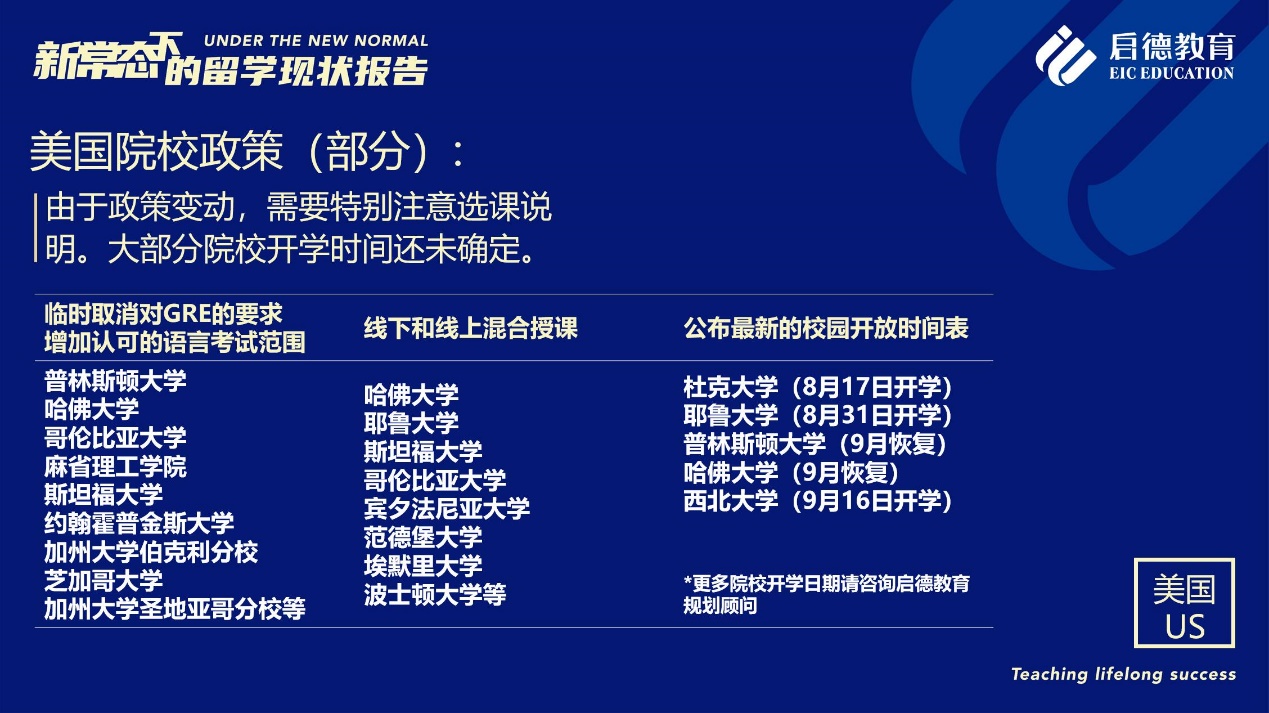 美國方面,據(jù)啟德留學美高本項目總監(jiān)孫靜介紹,大部分美國高校已經為學生提供了純線上課程、在中國高校(如清華大學、北京大學、中國海洋大學等)開課或延遲到春季甚至明年秋季入學的方案,對于現(xiàn)階段拿不到F-1簽證入境美國的學生,可以按照原計劃繼續(xù)學習。對于已有F-1簽證、已經回國或離開美國的同學,可以與學校的國際學生辦公室咨詢,確定自己是否可以在國內以線上上課的方式完成學位順利畢業(yè)。