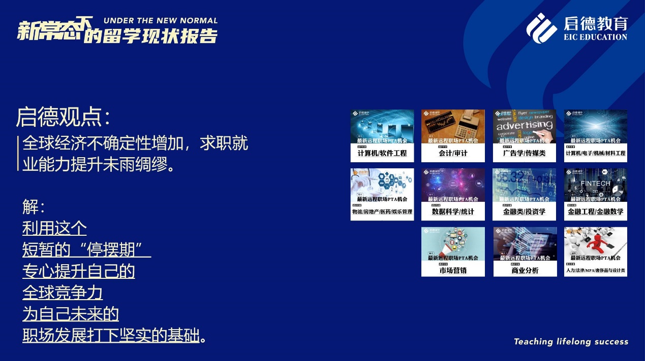 啟德留學美研項目總監(jiān)金鑫建議,對于正在準備留學申請、求職就業(yè)的同學來說,在密切關注相關國家與院校政策的同時,不妨利用這段時間參加線上科研項目,或是參加遠程實習及遠程 PTA ( Part-Time Assistant )項目,豐富學術或職場經歷,為留學申請和求職就業(yè)積累背景、提高競爭力。