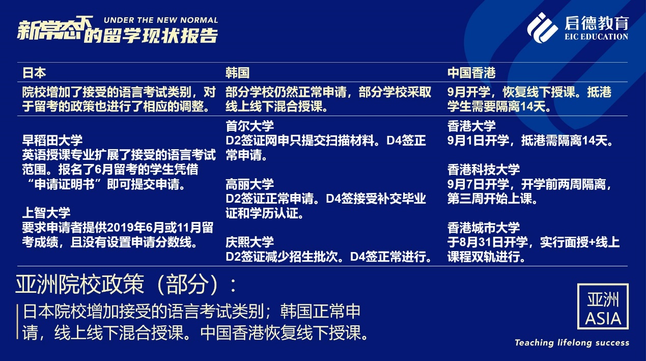 日本2020年入學學生的在留資格均已下發(fā),但針對留學生的入境政策目前還未最終公布。新加坡公立院校的新生留學簽證已正常批復;私立院校的新生可以提交申請,但暫緩受理。據(jù)啟德留學亞洲項目總監(jiān)李陽介紹,中國香港、中國澳門地區(qū)秋季各院校均計劃如期復課,以網課+面授的形式完成第一學期課程。