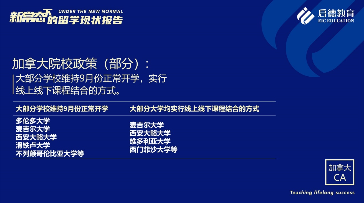 據(jù)啟德留學加拿大項目總監(jiān)羅瓊介紹,加拿大移民局近日宣布了有關留學生學簽的三項政策,一是優(yōu)先處理材料完整的學簽申請;二是實施兩個階段的學簽審批程序,為遠程學習的學生提供保障;三是針對今年秋季開課并于9月15日前提交學簽申請的留學生,遞簽后簽證等待和海外網課的時間可計入畢業(yè)工作許可的換算時長(前提是最終獲得簽證且50%的課程在加拿大境內完成),此措施使留學生即使因為疫情無法提交所有的必需文件,也可以在今年秋季報名注冊并線上學習。此外,正在加拿大境內的留學生,簽證申請可暫免指紋采集,今年1月后過期的簽證,可不受90天限制,在今年12月31日前都可提交恢復身份申請。