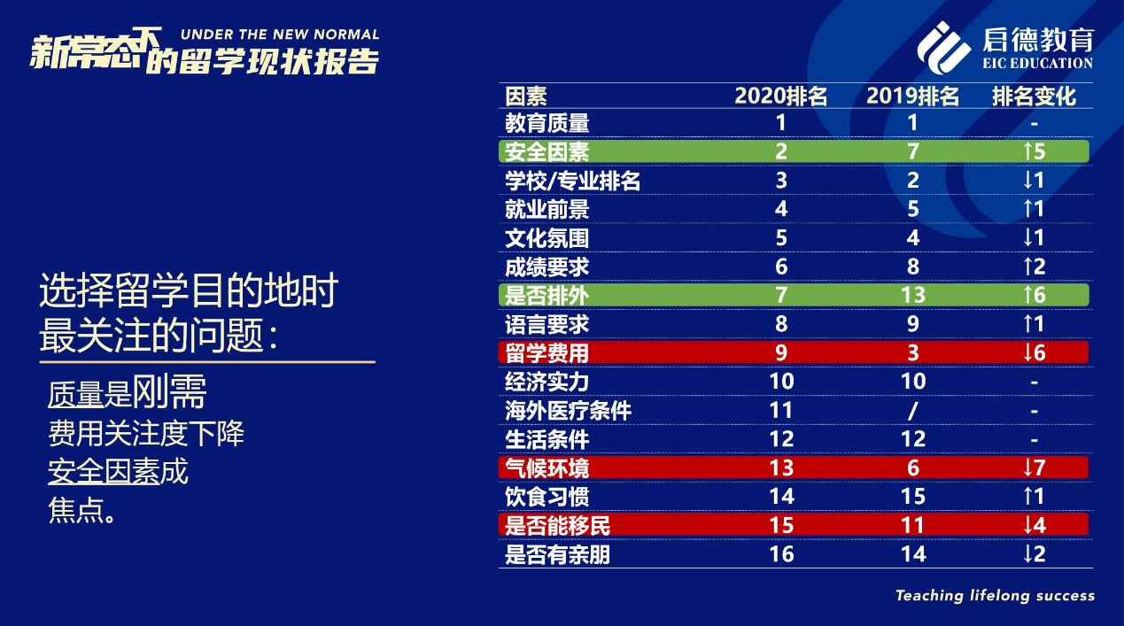 “安全因素”成為2020年中國學生在選擇留學目的地時最為關心的因素之一(排名第二),僅次于“教育質量”(排名第一)。同時,“是否排外”的排名也從2019年的第13位升至第7位。此外,在意向留學生希望就讀的學歷層次方面,2020年計劃攻讀研究生及以上學位的學生占比78.45 %,比2019年上升了0.75 %;攻讀本科(19.46 %)比2019年上升了0.96 %;而2020年計劃攻讀中學的比例(1.6%)有所下滑,比2019年下降了2.2%。