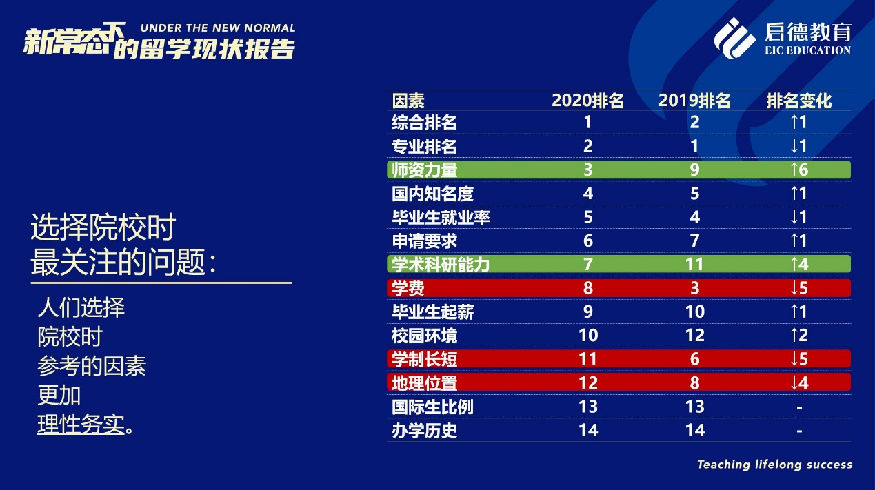值得關注的是,在“選擇院校時最關注的問題”中,“師資力量”的受關注度從2019年的第9位上升為第3位,僅次于“綜合排名”與“專業(yè)排名”,“國內知名度”與“畢業(yè)生就業(yè)率”分居第4位與第5位,“學術科研能力”從2019年的第11位上升至第7位,而“學費”、“學制長短”與“地理位置”等因素分別下滑至第8位、第11位與第12位??梢娫诰蜆I(yè)形勢尤其嚴峻的2020年,意向留學生對教育質量的剛性需求已進一步上升,以期在未來的就業(yè)市場獲得更具戰(zhàn)略優(yōu)勢的國際競爭力。