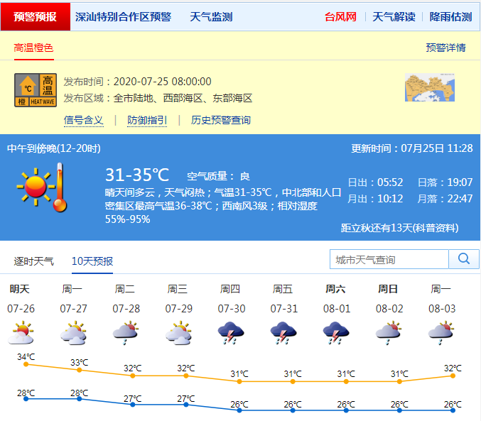 深圳市氣象局預(yù)計(jì)今明兩日深圳(含深汕)高溫天氣持續(xù),最高氣溫可達(dá)34-36℃;27-31日轉(zhuǎn)雷雨天氣,高溫天氣略有緩解,其中27-28日多云,有短時(shí)(雷)陣雨;29-31日有雷陣雨。