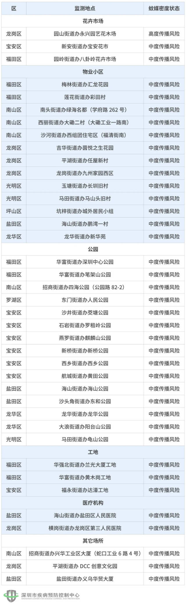 高、中密度的39個(gè)“黑點(diǎn)”里,有3個(gè)是花卉市場,13個(gè)小區(qū),15個(gè)公園,3個(gè)工地,2個(gè)醫(yī)療機(jī)構(gòu),3個(gè)其他場所。