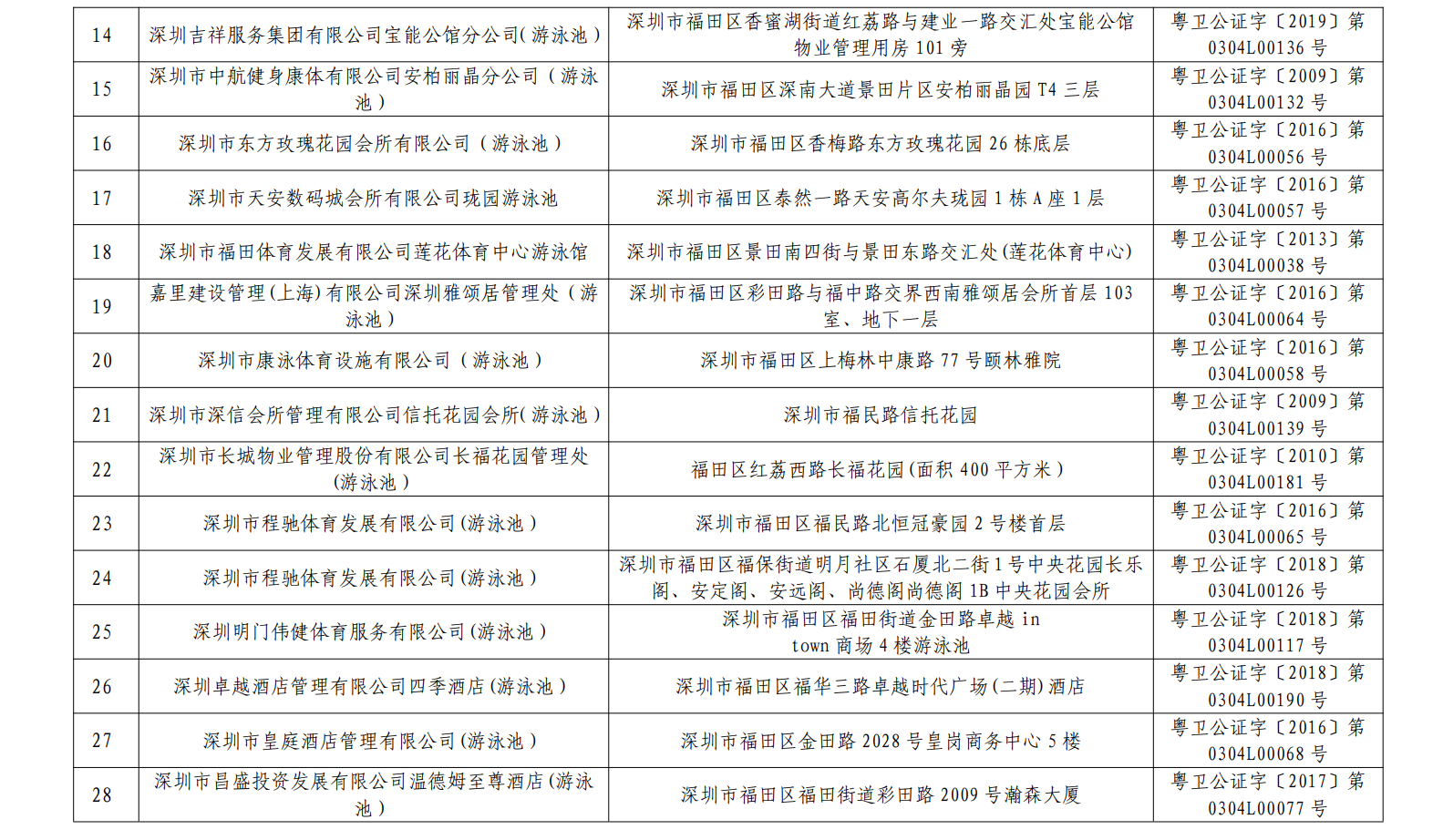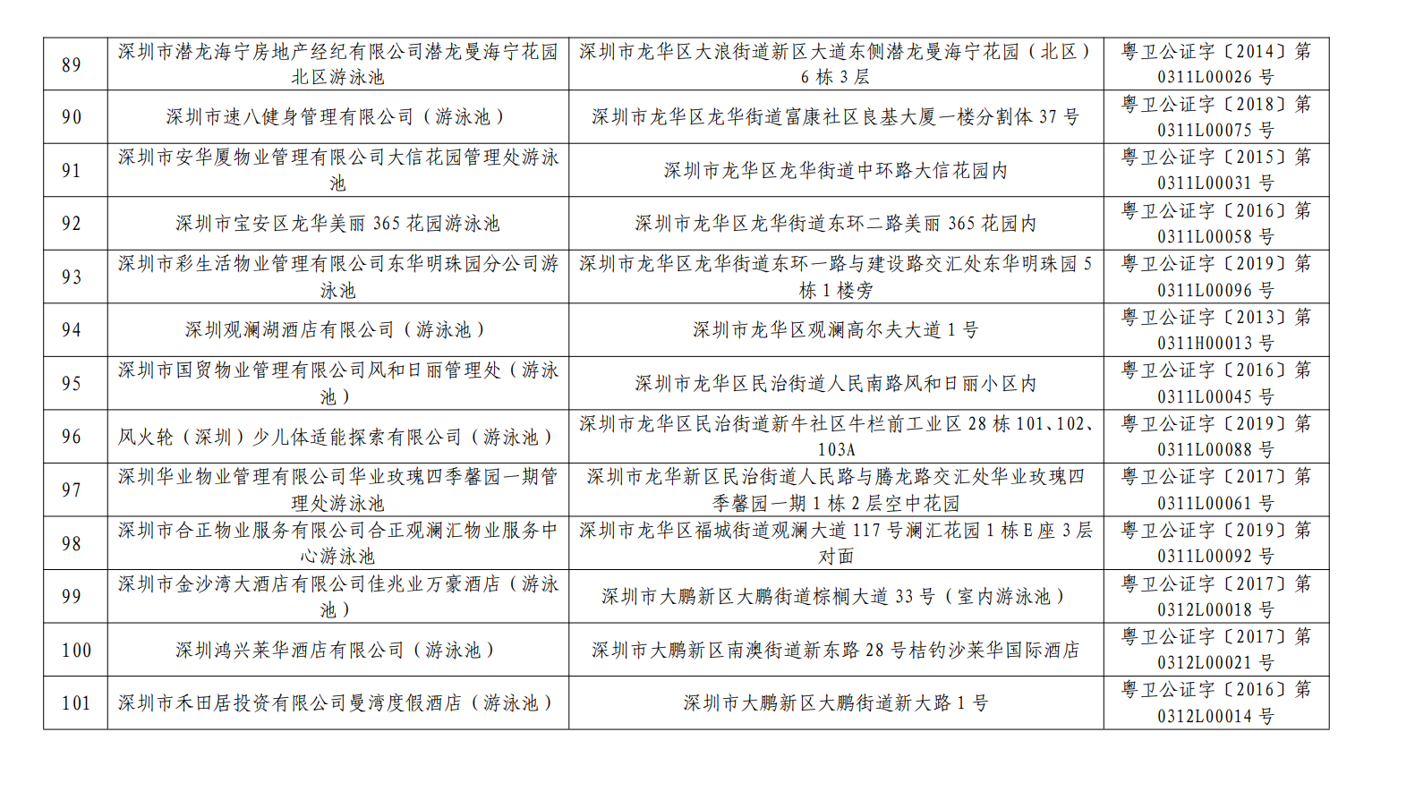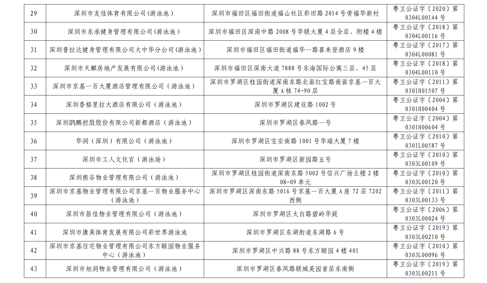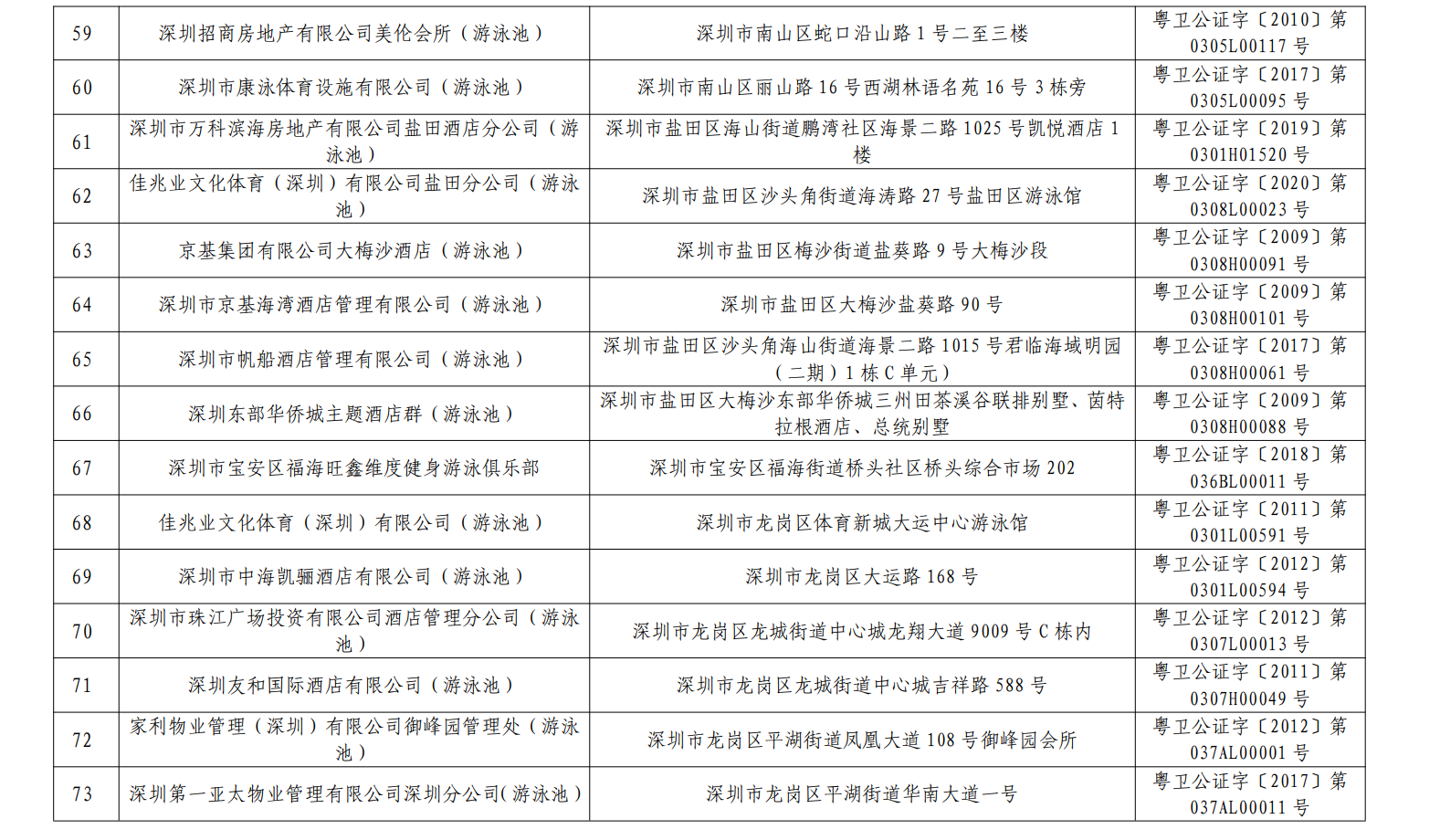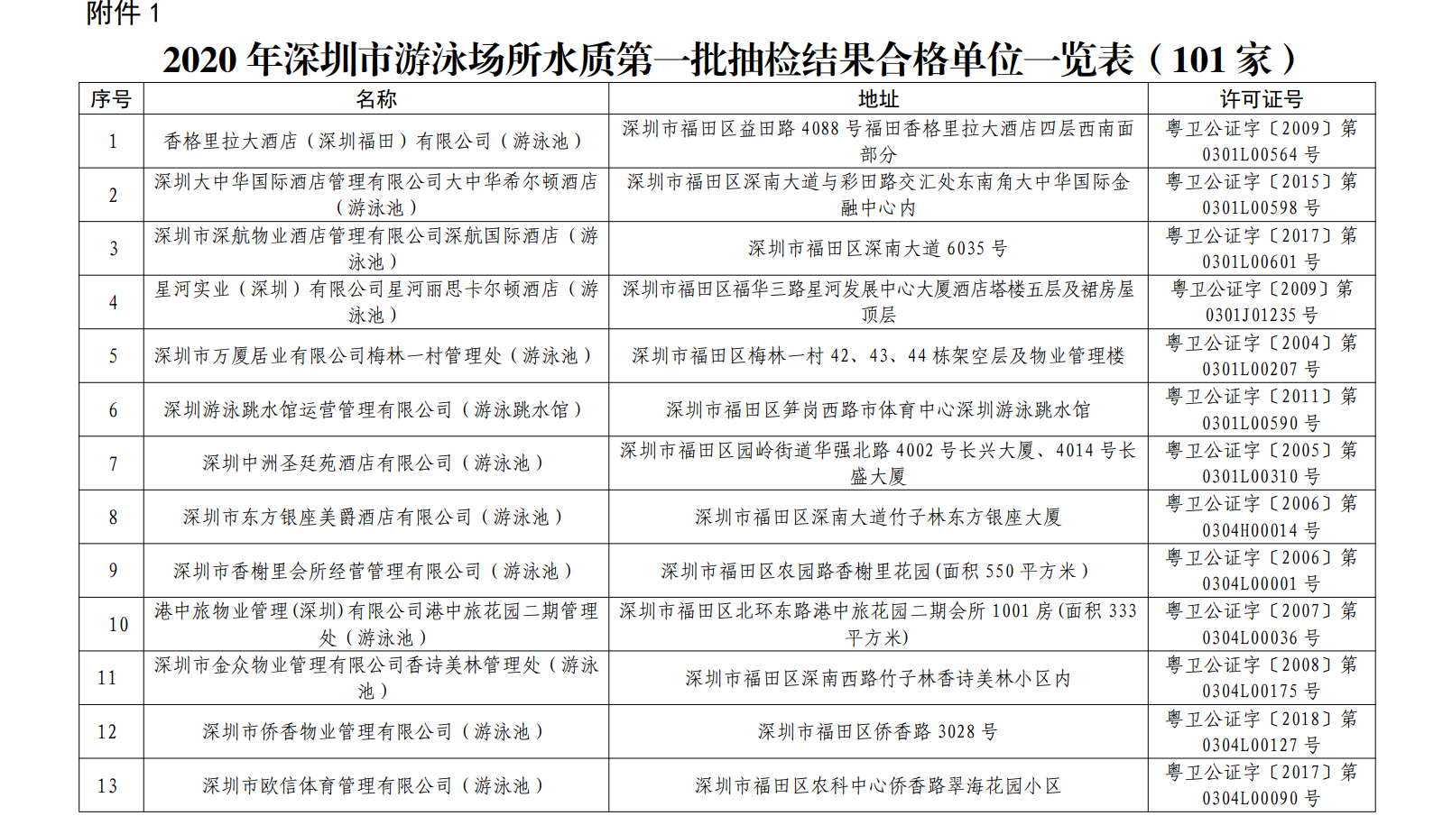 2020年深圳市游泳場所水質第一批抽檢結果合格單位一覽表(101家)