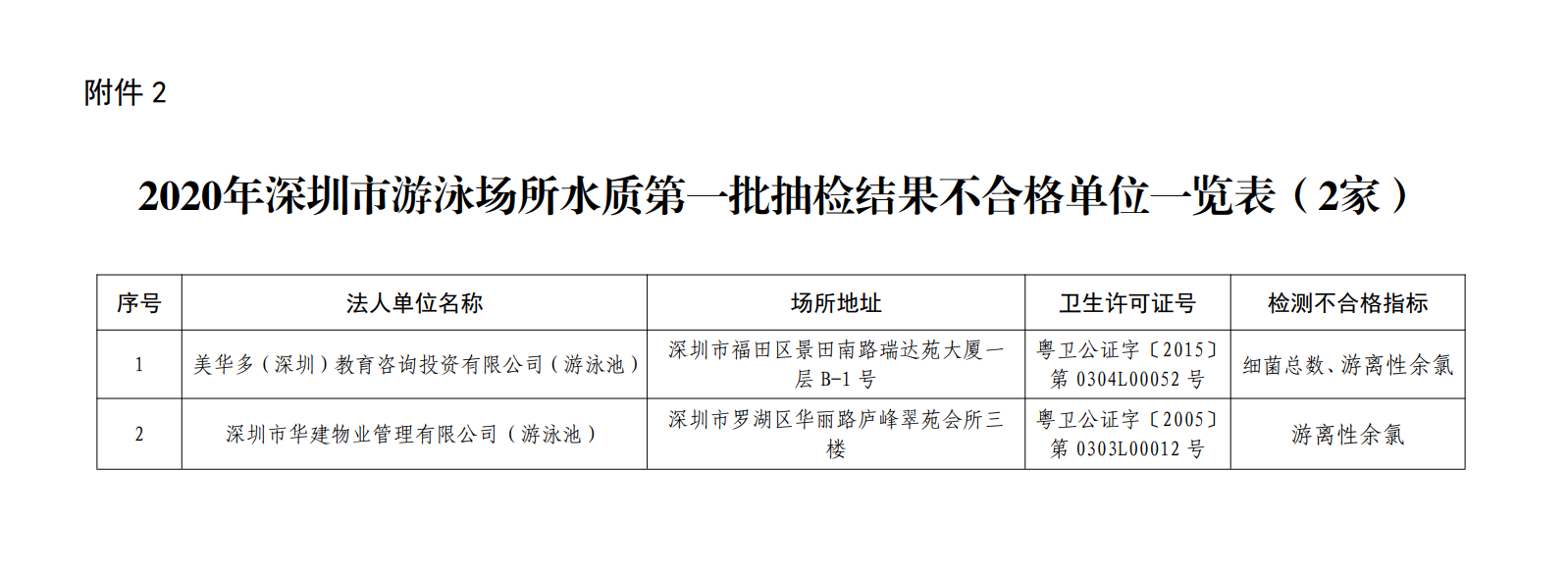 2020年深圳市游泳場所水質第一批抽檢結果不合格單位一覽表(2家)