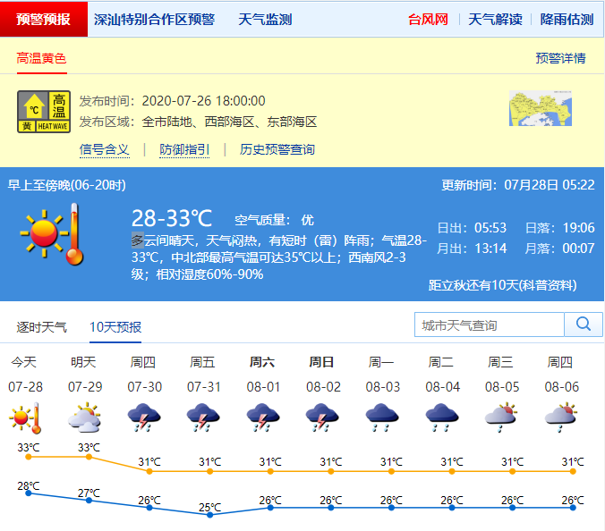 見(jiàn)圳客戶(hù)端?深圳新聞網(wǎng)2020年7月28日訊 根據(jù)深圳氣象局官方消息,7月28日白天多云間晴天,天氣悶熱,有短時(shí)(雷)陣雨;氣溫28-33℃,中北部最高氣溫可達(dá)35℃以上;西南風(fēng)2-3級(jí);相對(duì)濕度60%-90%。