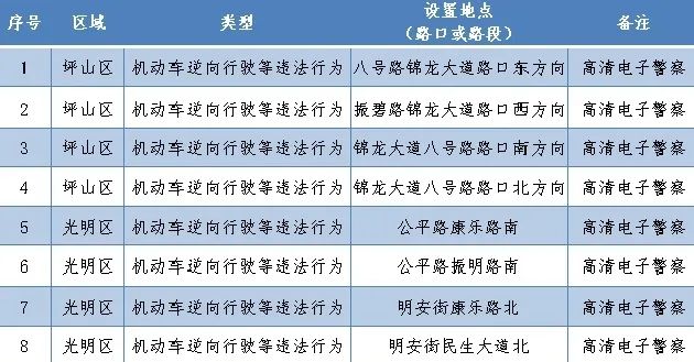 新增機(jī)動(dòng)車逆行高清電警設(shè)備8套,其中坪山區(qū)新增4套,光明區(qū)新增4套。
