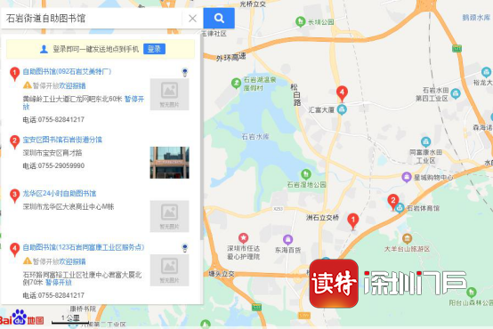 28日上午,記者通過登錄深圳圖書館街區(qū)自助圖書館查詢發(fā)現(xiàn),目前寶安區(qū)可以預(yù)借取書的公共服務(wù)點共有25個,其中石巖街道無服務(wù)點。而通過百度搜索,之前設(shè)置的石巖艾美特廠服務(wù)點和同富康工業(yè)區(qū)服務(wù)點顯示暫停開放。