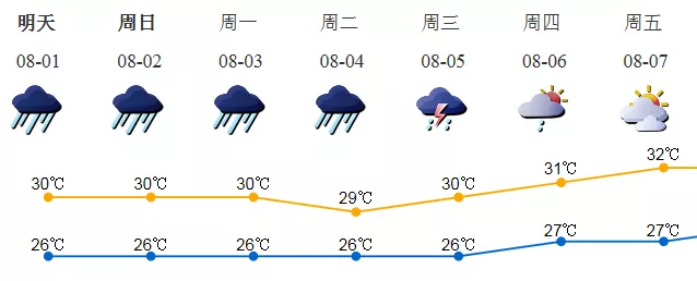 7月31日至8月2日我市有暴雨,東部、南部有大暴雨,沿海、高地和海區(qū)最大陣風(fēng)8-10級(jí)。3-5日仍有暴雨,局部大暴雨。