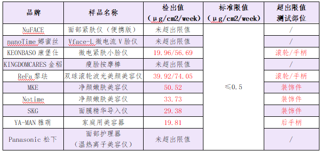 值得注意的是,在測(cè)試的10款家用美容儀樣品中6款樣品鎳釋放量測(cè)試結(jié)果不符合歐盟REACH法規(guī)要,包括KEONBASO康堡仕微電緊膚小臉儀、ReFa黎琺雙球滾輪波光美顏美容儀、MKE凈顏嫩膚美容儀、Notime凈顏嫩膚美容儀、SKG面膜精華導(dǎo)入儀、YA-MAN雅萌家庭用美容器。