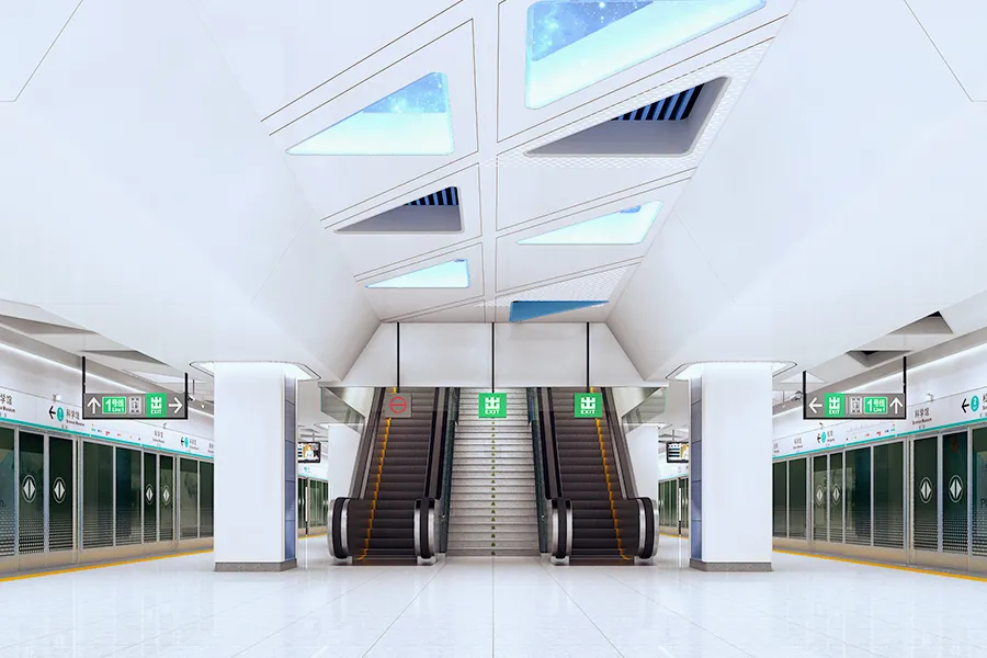 科學(xué)館站位于上步路與深南大道交叉口至濱河大道段,呈南北向布置。與1號(hào)線通道換乘,車站為地下三層單柱雙跨鋼筋混凝土框架結(jié)構(gòu),共設(shè)出入口6個(gè):E、F,物業(yè)口1、2、3、4。此外,與1號(hào)線換乘通道。