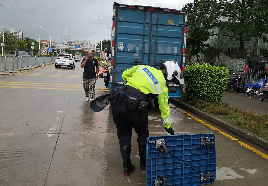 8月5日9時30分許,深圳交警鐵騎隊員雨中巡邏至新沙路時,發(fā)現(xiàn)德昌電機廠路段有一輛貨車停在路上,導(dǎo)致交通擁堵。貨車司機在旁,鐵騎上前詢問情況后得知貨車故障,司機被迫將車停在路邊。