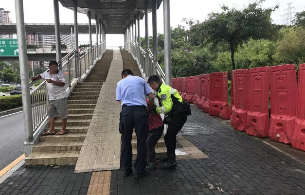 8月5日上午,深圳交警鐵騎巡邏至北環(huán)大道西往東方向珍珠嶺天橋路段輔道轉(zhuǎn)主道路口時,發(fā)現(xiàn)一位老太太躺在路中間。