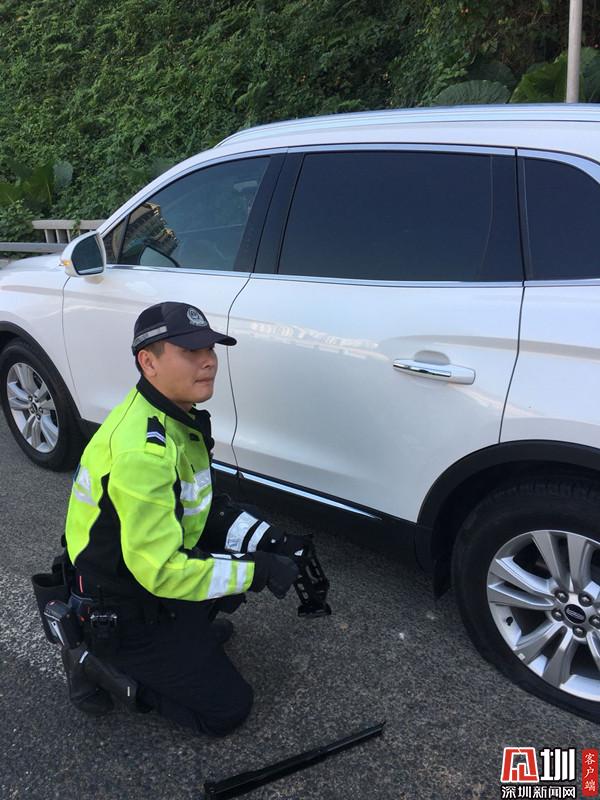 事情發(fā)生在10月11日早上10時30分許,劉先生駕車出外辦事,車輛行駛至東環(huán)高架西往東方向時,突然一聲巨響左后輪輪胎爆裂車輛半路拋錨,當(dāng)時正值交通早高峰,過往車輛不斷,故障車輛停在道路中間導(dǎo)致路段交通擁堵,車主劉先生一時間不知所措,只能留在原地等待救援。此時正在執(zhí)行巡邏任務(wù)的羅湖交警鐵騎組長陳展廷見狀,立即停下警車上前查看情況,了解情況后,為了緩解該路段的交通擁堵,防止出現(xiàn)交通意外,陳展廷立即讓劉先生把車停靠在最右側(cè)車道,然后安排隊員用警車在故障車輛周邊設(shè)置出了安全警戒區(qū)域,另一位隊員則對過往車輛進行指揮疏導(dǎo)及勸慰駕駛?cè)瞬灰?,在安全區(qū)域等待,陳展廷則俯下身為爆胎車輛更換輪胎。約15分鐘的忙碌后,三位鐵騎隊員已滿身是汗,但在他們的密切協(xié)調(diào)配合下,快速幫助駕駛?cè)藙⑾壬鷶[脫困境,險情在最短時間內(nèi)被及時排除,道路交通秩序也恢復(fù)正常,這暖心一幕讓劉先生很是感動,緊緊握著陳展廷同志的手連聲表示感謝。