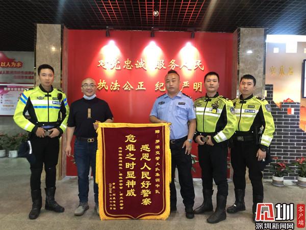 10月14日上午11時許,劉先生帶著錦旗來到羅湖交警大隊?!案兄x交警大隊機訓(xùn)中隊陳展廷組長、黎警官、黃警官對我的幫助,今天專程過來感謝你們。”劉先生激動地說。