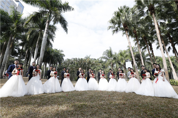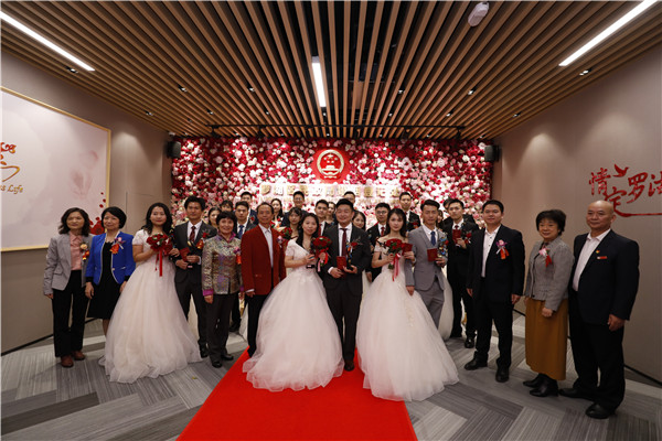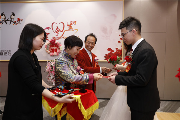 銀婚老人為12對(duì)新人頒發(fā)結(jié)婚證