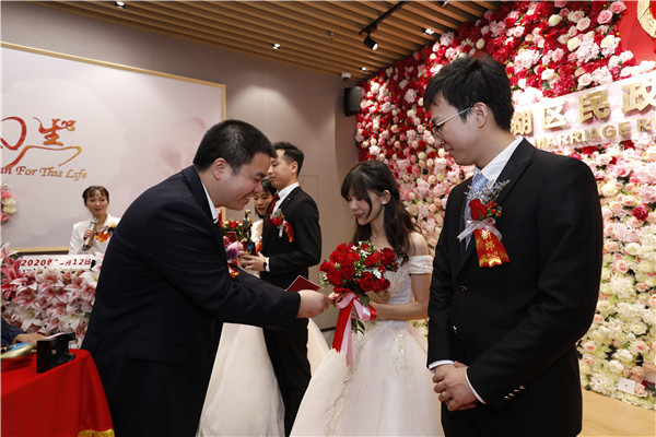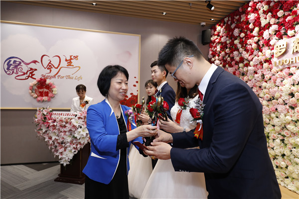 見圳客戶端·深圳新聞網(wǎng)12月12日訊(記者 李慧 通訊員 黎少忠 黃穎怡)“1212,要愛要愛!我們結(jié)婚啦!”,“雙十二”對(duì)大部分人來說是一個(gè)購(gòu)物的好日子,但對(duì)打算步入婚姻的新人們來說,卻是一個(gè)不可錯(cuò)過的登記好時(shí)機(jī)。12月12日,羅湖區(qū)婚姻登記處四處洋溢著歡樂的笑聲,12對(duì)新人在滿是玫瑰花的婚姻登記處中舉行集體結(jié)婚儀式。據(jù)悉,這也是疫情以來羅湖區(qū)首場(chǎng)結(jié)婚登記集體頒證儀式。