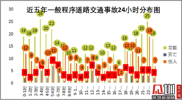 羅湖交警通過研判分析近5年的事故,發(fā)現(xiàn)凌晨5時至7時,是亡人事故的高發(fā)的時段之一;凌晨3至6時、夜間21至22時是一般程序道路交通事故高發(fā)時段,分別發(fā)生事故68宗和45宗、占總數(shù)的18.84%和12.47%。其中凌晨的5時至7時是亡人事故的高發(fā)時段之一,占總亡人事故的22.64%。