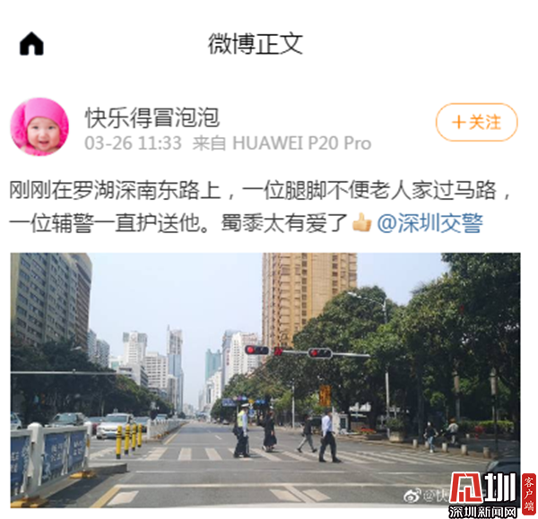 隨后,湊巧看到這一幕的網(wǎng)友將輔警護(hù)送老人過馬路的照片在微博上發(fā)布并配文:“剛剛在羅湖深南東路上,一位腿腳不便的老人家過馬路,一位輔警一直護(hù)著他。蜀黍太有愛了“。路過的行人也對交警這一暖心的小舉動(dòng)贊不絕口,大家紛紛贊揚(yáng)羅湖交警是暖心正能量。