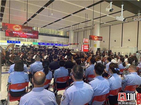 作為慶祝中國共產(chǎn)黨成立100周年專題節(jié)目、蓮塘邊檢站黨史教育學(xué)習(xí)專題活動,音樂會在莊嚴(yán)神圣的升旗儀式中拉開序幕,深圳交響樂團的68名資深演奏人員在嶄新的出入境邊防檢查通道前,奏響了一首首紅色經(jīng)典旋律,與現(xiàn)代化的口岸邊防檢查設(shè)施交相輝映,激蕩回響、動人心魄,體現(xiàn)蓮塘邊檢站全體民警對黨忠誠、服務(wù)人民、執(zhí)法公正、紀(jì)律嚴(yán)明的赤膽忠誠。音樂會在《沒有共產(chǎn)黨就沒有新中國》雄壯的齊唱聲中結(jié)束。