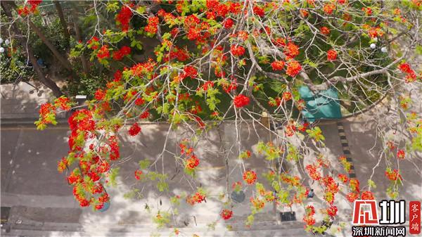 五月綻放全城的鳳凰花,映射著深圳這座城市的繁華與熱情,同時(shí)也給這座城市帶來(lái)勇敢熱烈的色彩。從鏡頭中可見(jiàn),鳳凰花花團(tuán)緊簇,在藍(lán)天的襯托下,那一簇簇火紅的花海張揚(yáng)而又高調(diào)地綻放,為深圳“藍(lán)”染上了一抹紅。