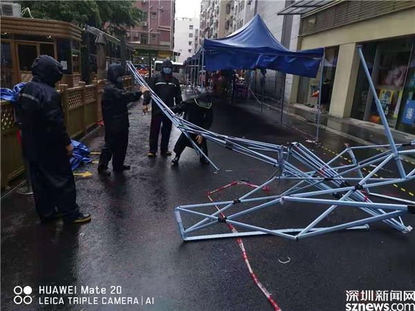 6月22日早上,黃貝街道工作人員在風(fēng)雨中搭建核酸檢測點帳篷。