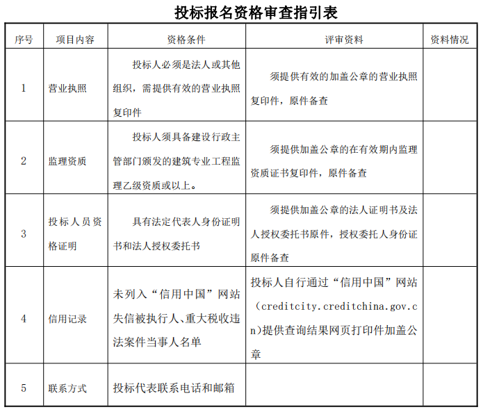 3.2報(bào)名時(shí)請(qǐng)攜帶投標(biāo)人必須具備的資格條件中要求的所有資格證明材料(請(qǐng)?zhí)顚懜郊?《投標(biāo)報(bào)名資格審查指引表》并按指引表將材料排序,所有材料須提供復(fù)印件并加蓋公章,原件備查),授權(quán)委托證明書原件、U盤及100元報(bào)名費(fèi)(無論中標(biāo)與否,報(bào)名費(fèi)一律不退)。
