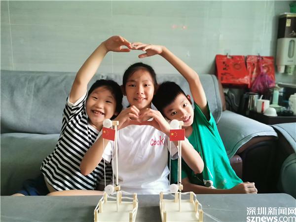 當(dāng)天下午,20位回答了問題的小朋友得到了獎品,一個大大的工具包。他們要將工具包帶回家,自己動手,拼裝一個五星紅旗升降臺。吳燕柔姐弟三人第一個完成,他們一起在家中舉行升旗儀式。姐姐慢慢搖動升降臺的把手,三雙大眼睛盯著冉冉升起的五星紅旗,齊聲唱響了國歌。姐姐升完了弟弟再升,三人輪流一番,國歌也就一遍遍響起。意猶未盡之際,姐弟三人還比了一個大大的心,與自己親手制作的五星紅旗升降臺合影。