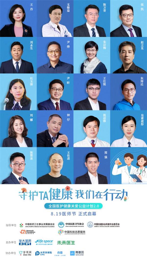 此次公益由中國醫(yī)藥衛(wèi)生事業(yè)發(fā)展基金會、中國民族衛(wèi)生協(xié)會、中國抗癌協(xié)會科普專業(yè)委員會、深圳猛犸公益基金會等機構(gòu)指導(dǎo),華大基因、Life-Space、未來醫(yī)生聯(lián)合主辦,早篩網(wǎng)、太平洋保險、約苗、微基因協(xié)辦,通過健康關(guān)懷禮包捐贈、公益科普直播、線上義診等系列活動,呼吁全社會關(guān)愛醫(yī)護人員,助力全社會形成“尊醫(yī)重衛(wèi)”的文化和氛圍;同時借助公益影響力,讓關(guān)愛輻射更廣泛人群,提高全民“早篩、早診、早治”的健康意識,助力健康中國。