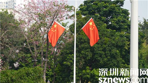 社區(qū)公園盛放的花朵、蔥翠的樹(shù)木,映襯得紅旗越發(fā)鮮艷。