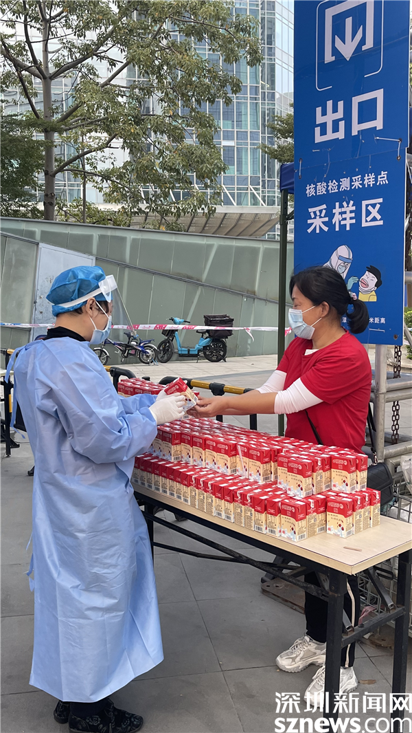 在筍崗街道初心公園核酸檢測點,市民在進行核酸檢測后可以去領(lǐng)取一瓶牛奶。據(jù)了解,這是深圳愛心企業(yè)專門為市民和醫(yī)護人員捐贈的,這一瓶瓶牛奶在深圳的冬天向醫(yī)護人員和市民送上了一份溫暖。