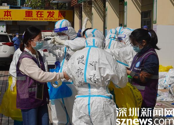 臘八節(jié)剛過,深圳帶著些許涼意,卻也是艷陽高照?!巴緜?,相互檢查一下手腕腳腕有沒有貼好!穿戴整齊后準(zhǔn)備集結(jié)出發(fā)啦!”在封控區(qū)外圍的醫(yī)護人員整備區(qū),一群身穿防護服、全副“武”裝的工作人員整裝待發(fā),兩人一組,目光堅定,向著封控區(qū)的入口走去。